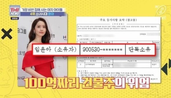 이날 비싼 집에 사는 여자아이돌 4위를 차지한 소녀시대 윤아는 부모님과 함께 거주하는 강남구 L아파트를 23억 원에 매입, 25억 2000만 원까지 올랐다고. 또 윤아는 청담동 역세권 빌딩을 100억 원에 사서 월 임대료만 3천만 원을 받고 있으며 빌딩 가격도 이미 100억 원에서 20억 원 이상 올랐다고 알려졌다.