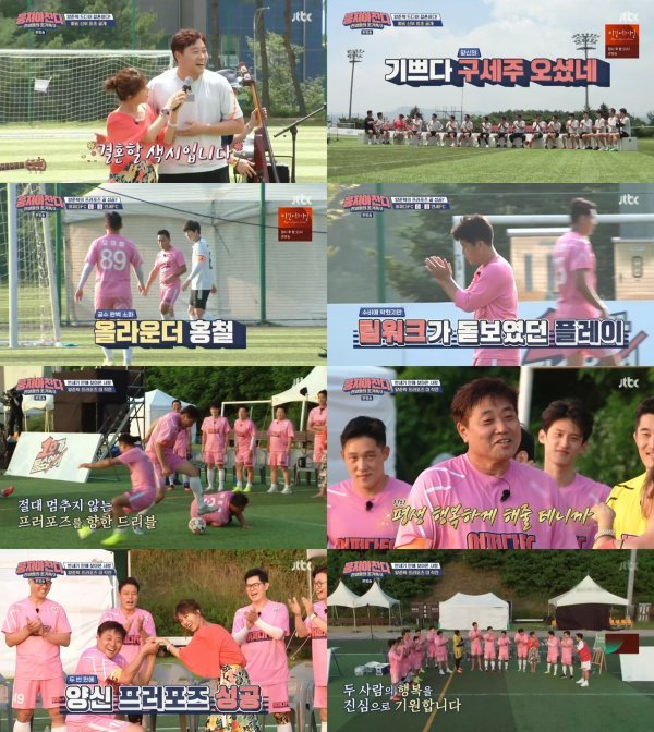 26일 방송된 JTBC ‘뭉쳐야 찬다’에서 전설들은 예비 신랑 양준혁의 프러포즈 슛 대작전으로 팀워크를 다지고 우승팀을 상대로 마지막 평가전을 치르며 귀한 경험치를 쌓았다.