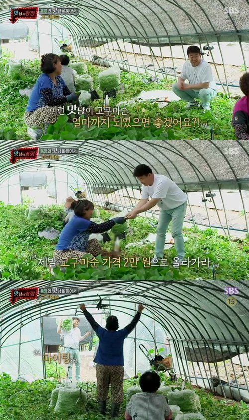 농민은 “낮은 수요와 가격하락으로 고구마순이 팔리지 않는다. 일주일 전에 1kg에 1700원이었지만 현재는 1300원까지 떨어졌다”라며 “그래서 그냥 갈아 엎기도 한다”라고 밝혀 백종원을 놀라게 했다.