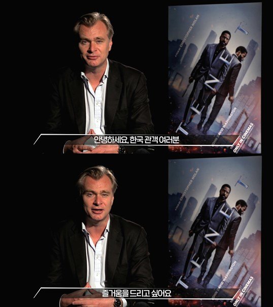 최고의 화제를 불러모으고 있는 영화 ‘테넷’의 크리스토퍼 놀란 감독이 한국 개봉을 기념해 한국 관객들에게 인사 영상을 전해왔다. 놀란 감독은 ‘테넷’을 한국 관객이 세계 최초로 보는 것에 기쁨을 전하기도 했다. 전작인 ‘인터스텔라’에 대한 한국 관객들의 호응에 감동하는 등 평소에도 한국 시장에 대해 지대한 관심을 가지고 있다. 진심으로 한국 방문을 원했으나 시기상 여의치 않아 다음 기회를 기약하기도 했다.