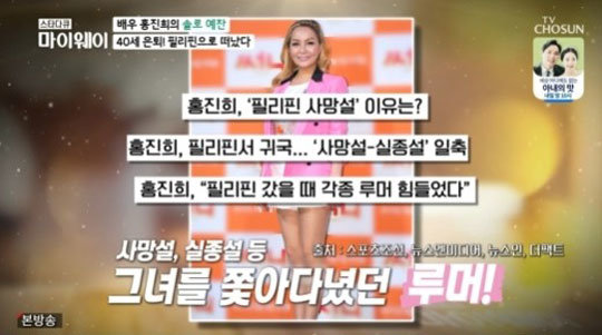 나이 마흔에 돌연 은퇴를 선언하고 제2의 인생을 꿈꾸며 필리핀으로 떠났던 홍진희. 하지만 사망설, 실종설 등 루머가 일기도 했다.