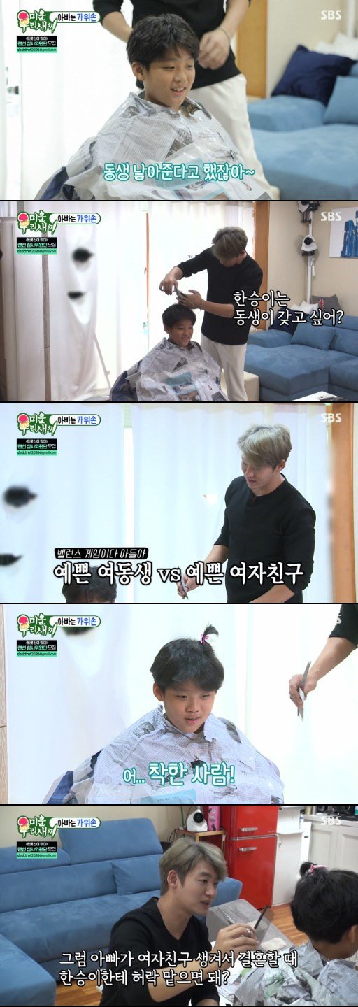 이날 아들 이한승 군의 머리가 너무 길어 아빠 이태성은 이발을 해주겠다고 나섰다. 그는 능숙하게 아들의 머리를 자르기 시작했다.