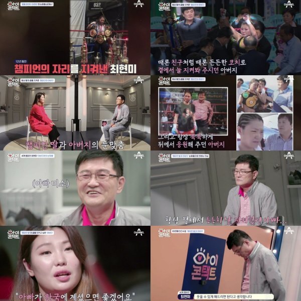 11일 방송된 채널A ‘아이콘택트’ 첫 에피소드에서는 대한민국 최초로 2체급을 석권한 ‘탈북 복서’ 최현미가 아버지의 초대를 받고 눈맞춤방을 방문했다. 2004년 14살에 복싱을 시작한 최현미는 18세 나이에 WBA 페더급 최연소 세계챔피언에 등극했으며, 2013년 챔피언 벨트 반납 뒤 한 체급을 올리는 새로운 도전을 감행해 또 다시 성공했다. 이 모든 과정을 함께한 사람이 바로 최현미의 아버지 최영춘 씨였다.