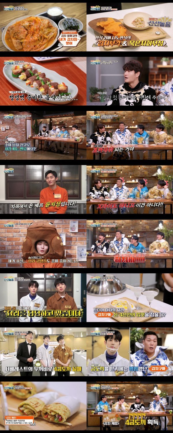 지난주에 이어 다양한 김치 레시피를 선보인 ‘볼빨간 신선놀음’. 어제 방송에서 가장 먼저 MC들을 놀라게 한 것은 김칫국물로 만든 스낵인 ‘김치 부각’이었다. ‘바삭한 김치전을 먹는 느낌’, ‘각종 소스를 곁들여 먹고 싶다’는 호평이 이어졌다. 하지만 ‘곁들여 낸 음식과 어울리지 않는다’는 성시경의 지적으로 금도끼 획득에는 실패했다.