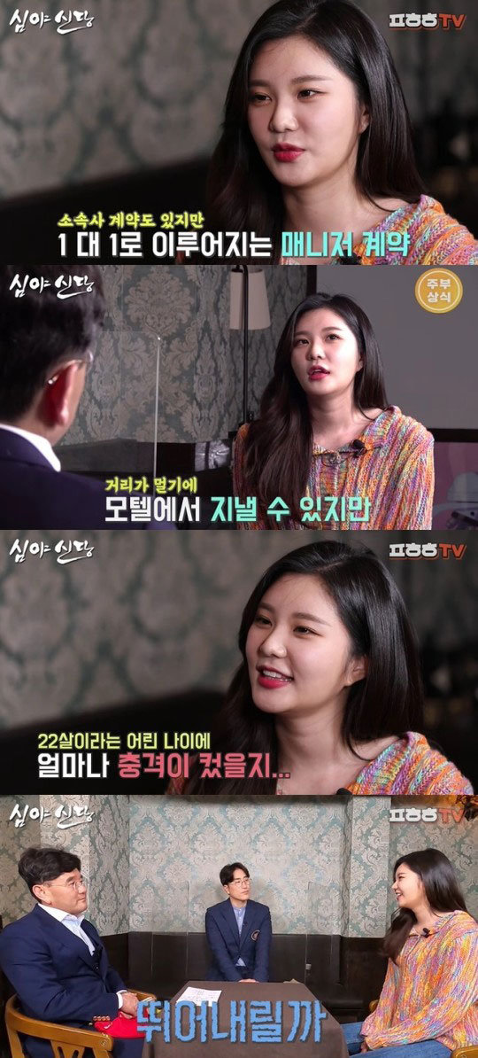 트로트 가수 지망생 강승연이 연예계 활동을 하기 위한 과정에서 힘들었던 과거를 털어놨다.강승연은 지난 5일 배우 겸 무속인 정호근이 운영하는 유튜브 채널 푸하하TV \'심야신당\'에 출연했다. ‘차마 입에 담지 못할 제안 받았던 트로트 가수 강승연’이라는 제목의 영상에서 강승연은 솔직한 입담으로 눈길을 끌었다. 강승연, 추악한 현실에 극단적 선택 시도