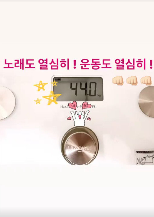 함께 공개한 사진에는 44kg이라는 숫자가 적혀있는 체중계가 보여 시선을 사로잡는다.