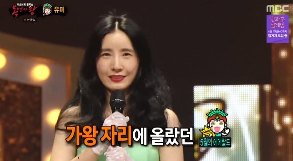 유미는 153대 가왕 발표 당시 눈물을 흘렸다. 유미는 “가수라면 ‘복면가왕’ 무대를 꿈 꿀 거 같아. 스스로가 대견하고 놀라웠다”고 당시를 회상했다. 김정은에게 축하 전화를 받았다는 유미는 “김정은이 매우 기뻐했다. 지금 홍콩에 있는데 형부한테 말 안 할테니까 정체를 알려달라더라”고 친분을 드러냈다.