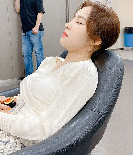 함께 공개한 사진 속 홍자는 KBS2 \'불후의 명곡\' 대기실 의자에서 눈을 감고 휴식을 취하고 있다.