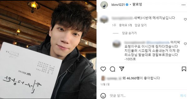 동아닷컴 확인 결과 해당 연예인은 김경남이었다. 지난 5일 김경남의 SNS 게시물에서 소음 피해를 호소하는 댓글이 포착된 것. 누리꾼은 “새벽 3시 반에 메시지 남긴다. 마지막 요청이다. 이 시간에 잠을 자다가 깼다. 지인을 불러 시끄럽게 소음 내는 것 이제 관리소장님 말씀대로 경찰 부르겠다”고 예고했다.
