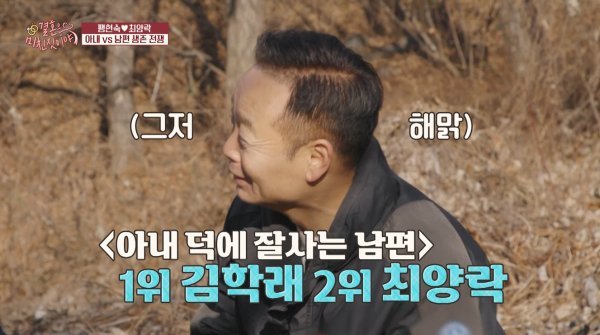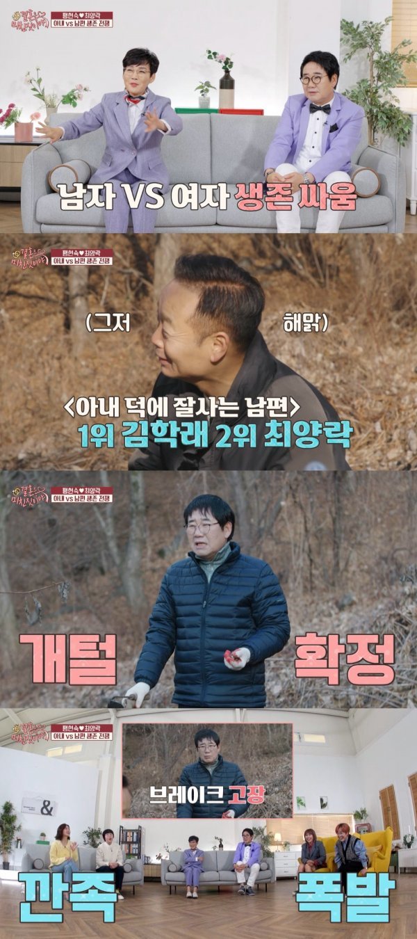특히 김학래는 혹시라도 명품 옷이 더러워질까봐 걱정만 털어놨고, 이를 본 최양락은 답답함에 “뭐라도 하라”고 다그쳤다. 보다 못한 팽현숙이 다가와 음식 재료 찾는 법을 알려줬지만, 김학래는 “통계가 나왔다. 아내 덕에 잘 사는 사람들 2위가 최양락, 1위가 나다”라는 철없는 소리를 해 웃음을 자아냈다.