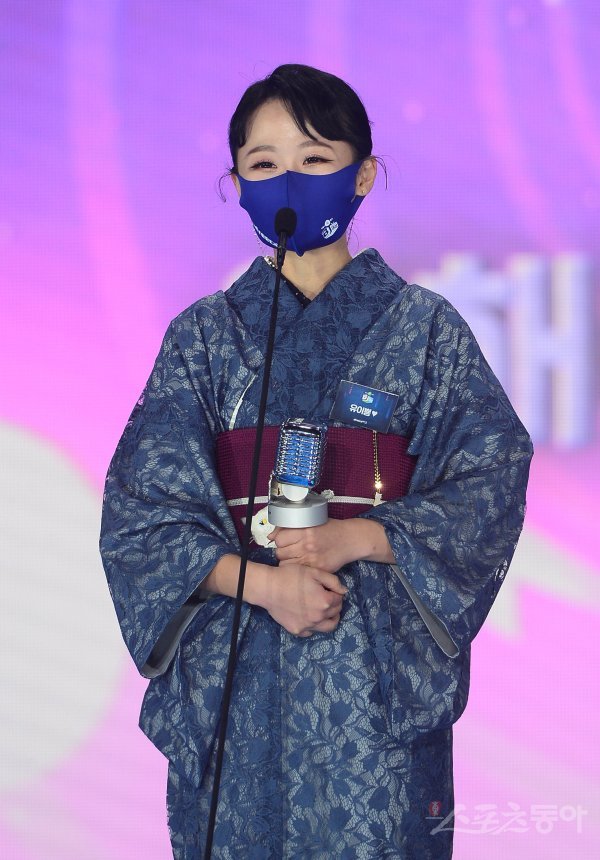 24일 서울 서초구 양재동 aT센터 전시장에서 열린 ‘NH콕뱅크와 함께하는 2021 아프리카TV BJ대상’ 시상식에서 부문별 올해의 상 이색현장BJ를 수상한 유이뿅이 소감을 말하고 있다.