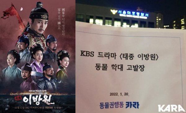 카라는 "KBS 태종 이방원 촬영 현장에서 일어나고 있는 동물 학대 정황을 확인함에 따라, KBS와 제작사에 공문 및 '카라 동물 출연 미디어 가이드라인' 을 전달함과 별도로 해당 촬영장 책임자를 동물학대로 경찰에 고발 접수했다"라고 전했다.