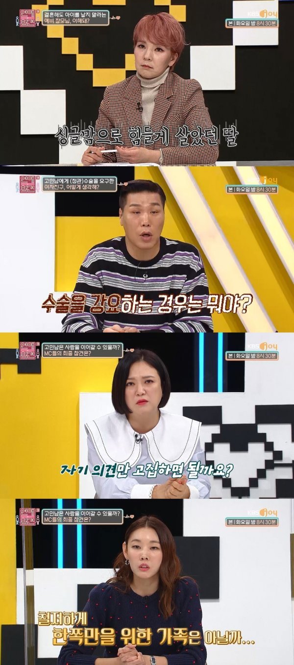 한혜진은 "타인 인생의 중요한 파트를 날려버릴 만한 중대한 사안을 결정할 땐 상대의 허락이 필요하다. 내가 힘든 고통을 겪었다고 해서 그걸 이유로 상대의 행복을 빼앗을 수는 없다"라고 이야기 했고, 곽정은은 "여자친구는 자신과 딸, 2명이서 충분했던 성을 지키는 게 중요한 거다. 그래서 양보할 생각이 없다. 하루라도 더 만나는 게 상처가 될 거다"라고 조언했다.