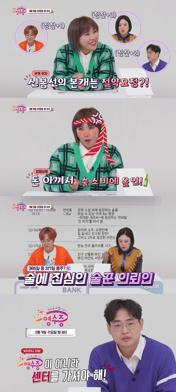 9일 방송되는 KBS Joy 예능 프로그램 '국민 영수증' 22회에서는 신봉선 영수증을 들여다보는 3MC 송은이, 김숙, 박영진 모습이 그려진다.