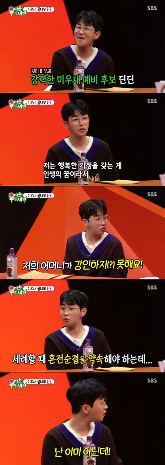 또한 신동엽이 “딘딘 때문에 어머니가 많이 우셨다고 들었다”고 하자 딘딘은 “저희 어머니가 강인하지 못하다”며 다른 어머님들 보다 눈물이 많은 편이라고 해명했다. 이어 딘딘은 살면서 부모님께 한 가장 미운 짓으로 교회에서의 세례 사건을 꼽았다. 그는 "목사님이 주님 앞에서 혼전 순결을 약속하면 \'아멘\'을 외치라고 하셨다. 난 이미 아닌데, 교회에서 거짓말하면 안 될 것 같아서 결국 세례를 포기했다”고 솔직하게 고백해 폭소케 했다.