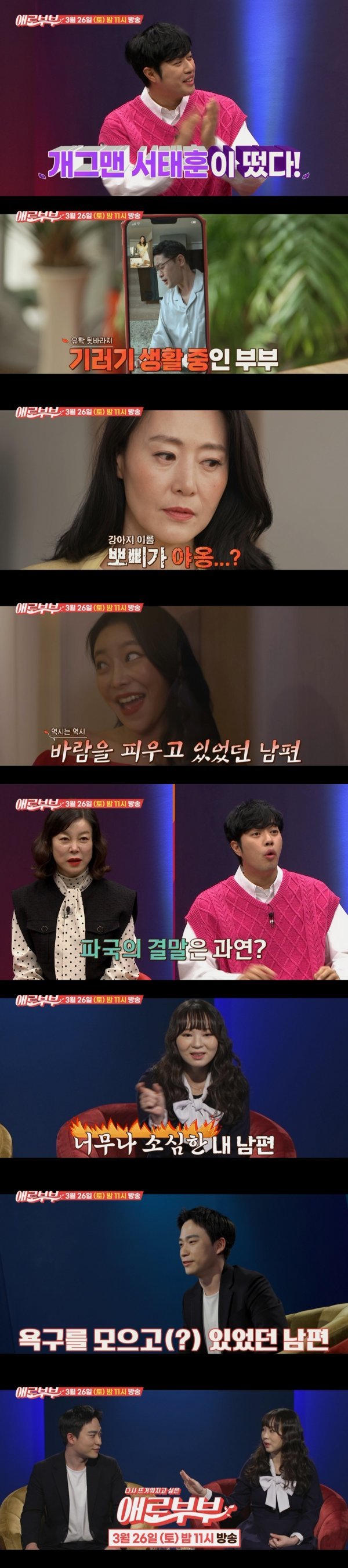 26일 방송될 ‘애로부부’ 예고편에서는 자녀의 유학 뒷바라지를 위해 기러기 생활 중인 부부가 등장한다. 일에서 성공하며 잘 나가던 사연자 아내는 유학을 가고 싶다는 아들을 위해 일을 내려놓고 해외 생활을 시작했다. 그러던 어느 날 영상통화를 하던 남편이 “뽀삐, 저리가”라며 강아지에게 말을 건넸지만, 아내는 뽀삐가 내는 “야옹” 소리를 듣고 뭔가 이상함을 느꼈다.
