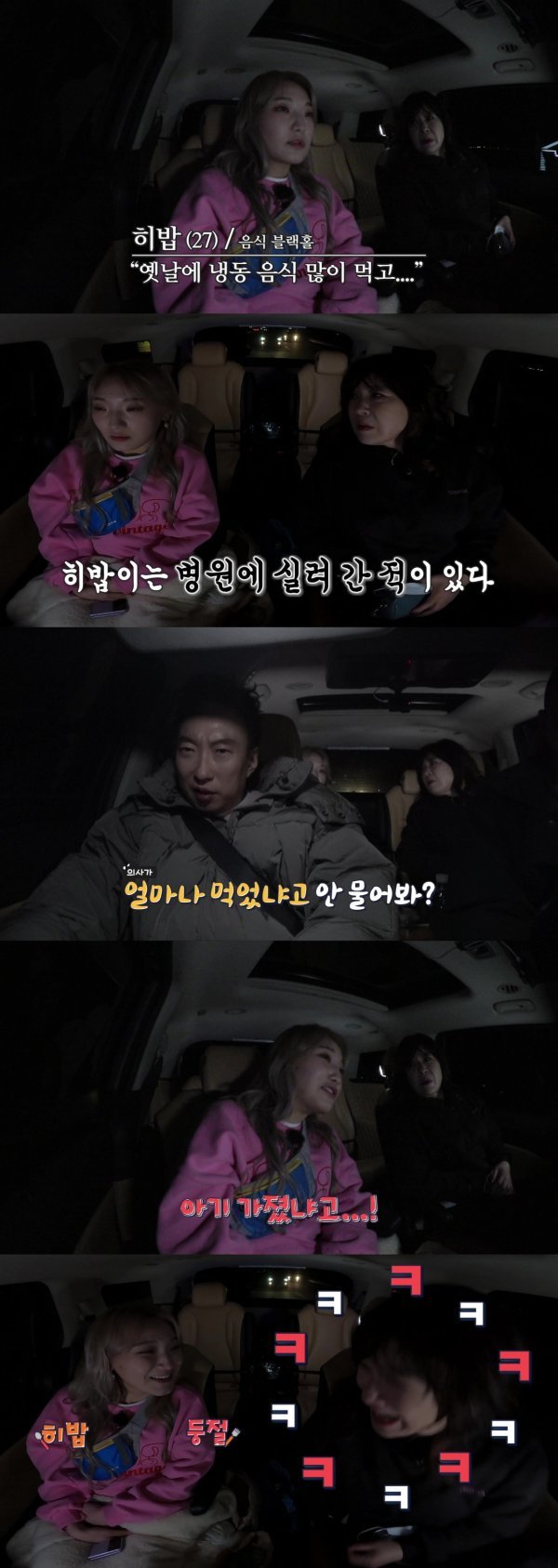 매번 놀라운 식욕을 보여줬던 히밥은 이날 임신 에피소드를 꺼낸다. "예전에 냉동음식을 많이 먹고 배탈이 나서 병원에 실려 간 적이 있다"고 말문을 열었다.