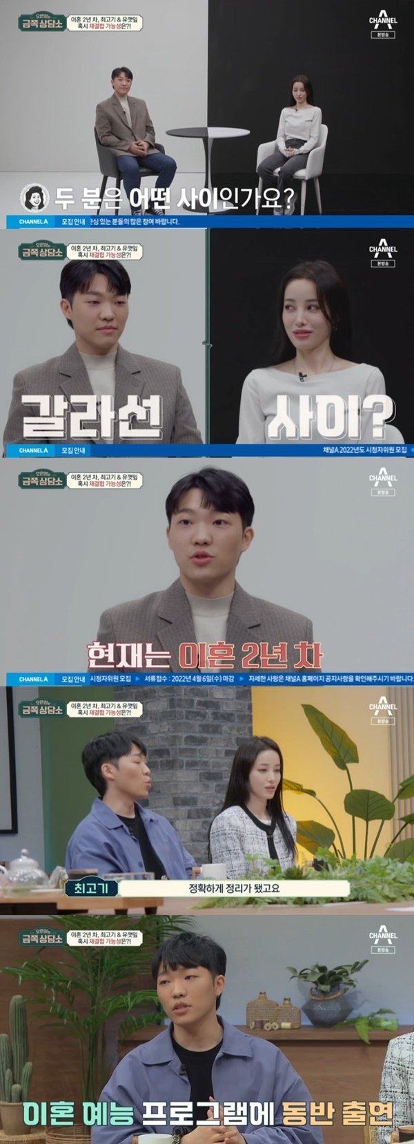 1일 오후 방송된 채널A 예능프로그램 ‘오은영의 금쪽상담소’에서는 유튜브 크리에이터 최고기와 유깻잎이 상담소 최초 ‘이혼 부부’ 고객으로 방문한 장면이 그려졌다.