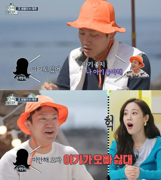 이어 두 사람은 제주도 통갈치 먹방에 나섰다. 이때, 조준호는 “나 사실 이 가게 소개팅하러 와봤다”라고 털어놨다. 그러면서 그는 “잘 먹다가 할 말이 있다고 하더라. 자기 갔다 왔다고. 아기도 있다고. 괜찮다고 아기 좋아한다고 했더니 ‘미안해 오빠. 아기가 오빠 싫대’ 실화다”라고 말했다.