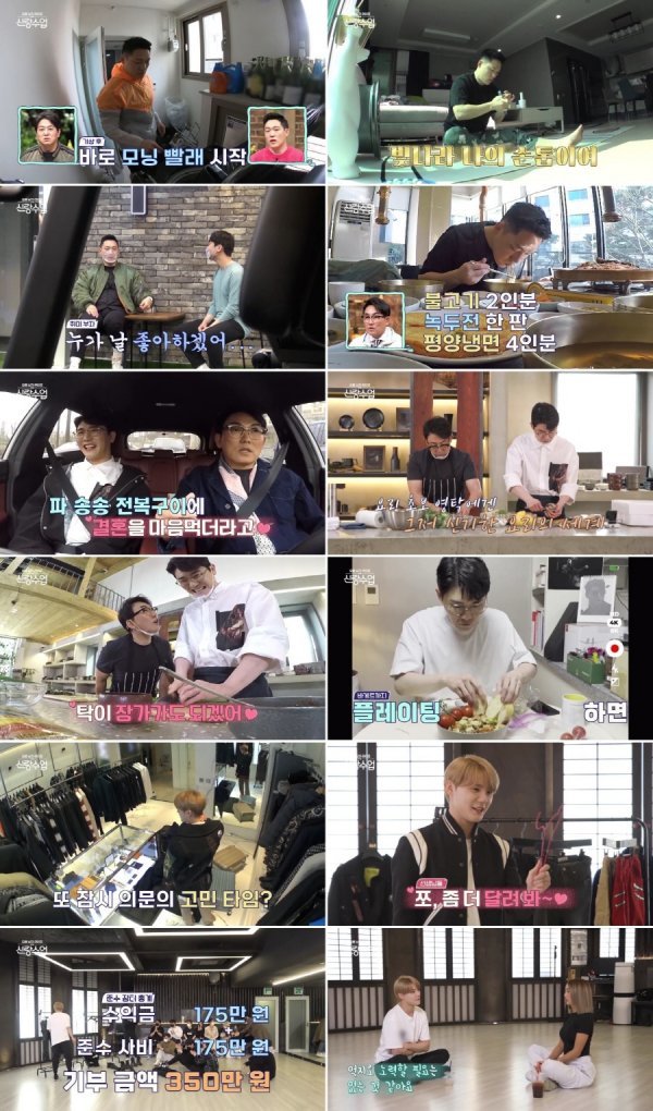 이어 모태범은 자신이 운영하는 피트니스 센터로 향해 ‘CEO’ 모드에 돌입했다. 선수 시절부터 자신의 담당 트레이너였던 동업 친구를 만나 센터를 점검한 모태범은 오랜만에 재활 훈련을 받았고, 이후 ‘최애 단골집’인 냉면집에 도착했다. “어제도 뵙고 오늘 또 뵙죠~”라며 이모에게 ‘콧소리’를 낸 모태범은 불고기 2인분, 녹두전 1인분에 평양냉면 4인분을 가뿐하게 해치우며 신들린 ‘국대급 먹방’을 선보였다. 집에 돌아온 뒤에는 와인으로 ‘혼술’을 하며, 뜨개질로 수세미를 만드는 모습으로 반전 매력을 폭발시켰다. 마지막으로 모태범은 직접 만든 수세미를 ‘신랑수업’ 형님들에게 선물해, 입학 점수를 대거 획득했다.