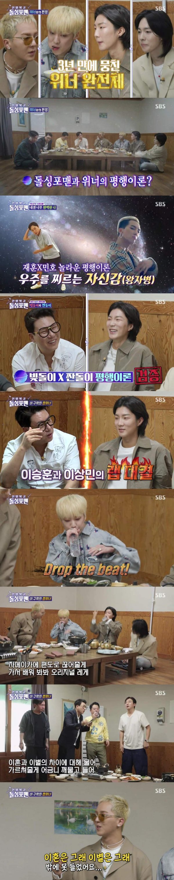 이상민과 이승훈은 빚돌이와 짠돌이로 평행이론을 설명했다. 이어 두 사람은 래퍼라는 공통점이 있다며 랩부심을 자극, 랩 대결을 시작했다. 이승윤은 강승윤의 비트박스에 리듬을 타며 이상민이 쓰고 있는 검정 뿔테 안경을 지적하고, 이상민의 랩은 하나도 안들린다며 돌싱포맨을 디스하는 랩을 거침없이 선보였다. 이에 발끈한 돌싱포맨은 위너의 랩이 끝나기도 전에 단체 기립을 하며 흥분했다. 이 장면은 이날 7.1%까지 치솟으며 최고의 1분을 장식했다.