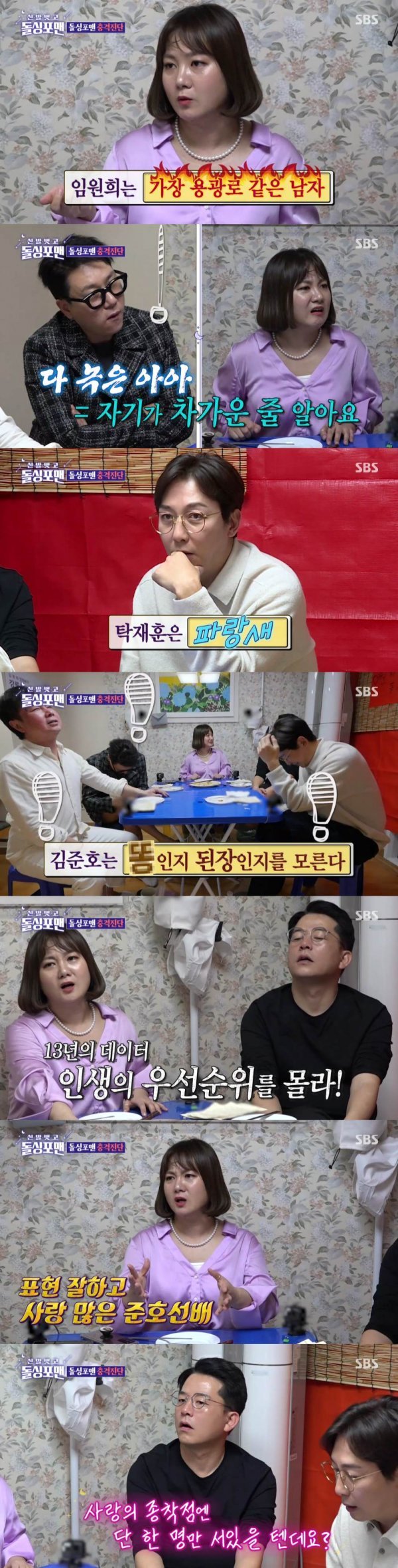 마지막으로 오랜 시간 봐왔던 절친 선배 김준호에게는 “똥인지 된장인지를 모른다. 인생의 우선순위를 모른다"고 돌직구를 날렸다. 이어 "준호 선배는 표현도 많고, 사랑꾼이다. 다 해주려고 한다. 사람은 가리면 안 되지만, 사랑의 종착점에는 단 한 명만 서있을텐데 어떡할 거냐"며 진심 어린 조언을 건넸다. 이에 준호는 “그 말이 맞다”며 고개를 끄덕였다.