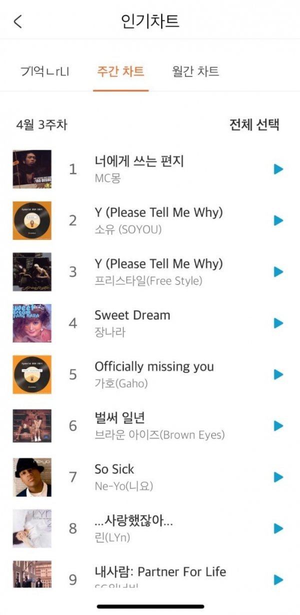 한 주간 싸이월드 유저들이 도토리를 주고 산 음원 판매량을 기준으로 순위를 매기는 주간차트에서 첫 1위는 MC몽의 ‘너에게 쓰는 편지’가 차지했다.