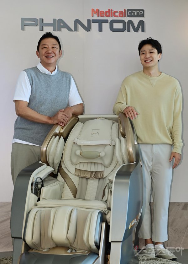 전 감독 허재와 원주 DB 허웅이 3일 서울 중구 한 글로벌 헬스케어 매장에서 열린 가정의 달 기념 포토행사에서 포즈를 취하고 있다.