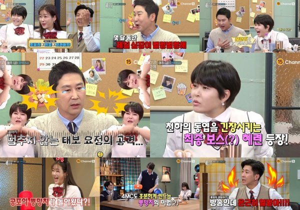 세 사람의 등장에 모두가 반가워하는 가운데 유독 신동엽만은 잔뜩 긴장한 모습이다. 바로 무서운(?) 찐친인 조혜련이 옆자리에 앉게 된 것. 신동엽은 “친구지만 몇 달 동안 제일 심장이 벌렁벌렁해.. 혜련이가 옆에 있으니까!”라며 심장을 부여잡아 웃음을 자아낸다.