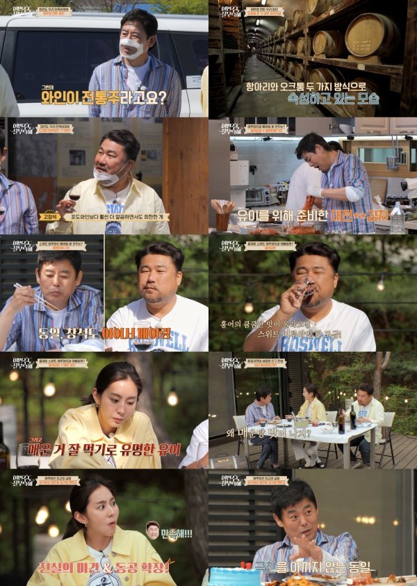 유이가 직접 구운 매운 닭발, 성동일의 홍어 삼합, 그리고 매운 김치까지 한 상이 차려졌다. 성동일은 “그간의 여행 중 가장 다양하고 고급지다”라며 뿌듯해했다. 먼저 스위트 와인과 안주 페어링에 나선 고창석은 “쫄깃한 식감이 너무 맛있다”라며 닭발에 감탄했다. 성동일이 와인과 홍어 삼합을 페어링하며 “홍어의 거부감 드는 냄새를 와인이 싹 잡아준다”라며 평하자, 홍어 삼합에 도전한 유이는 성동일에 격하게 공감했다.
