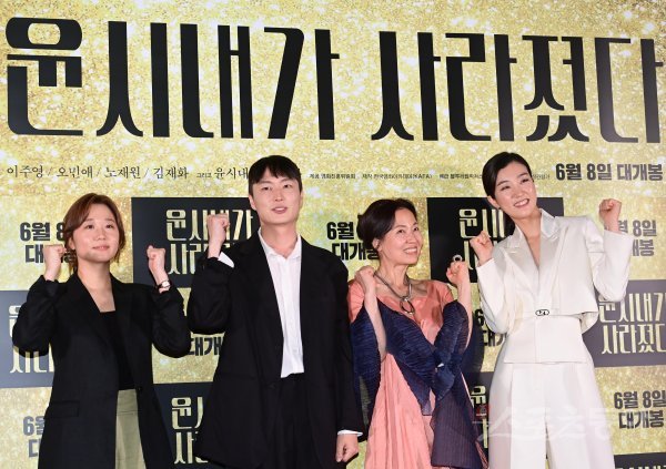 김진화 감독, 배우 노재원, 오민애, 이주영이 25일 서울 광진구 자양동 롯데시네마 건대입구점에서 열린 영화 ‘윤시내가 사라졌다’ 언론시사회에서 포즈를 취하고 있다.