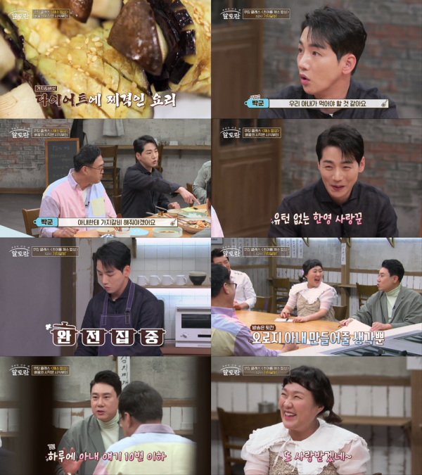 이어 “가지갈비 레시피를 배워 아내에게 해줘야겠다”라며 알토란 수강생으로 나선 박군. 그는 까다로운 칼집 내기도 척척해내며 요리에 초집중한다. 그러나 요리에 온 관심이 쏠려 멘트를 하지 않는 박군에게 MC 이상민은 “방송할 생각을 해야지, 아내에게 만들어줄 생각만 하고 있다”며 장난스럽게 타박한다.
