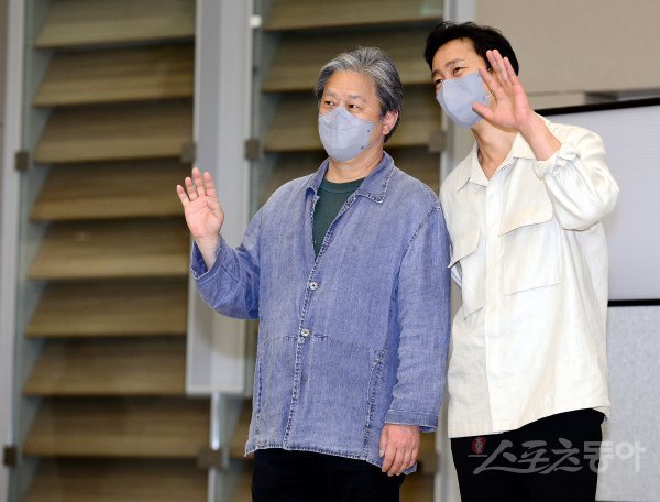 제 75회 칸국제영화제에서 영화 ‘헤어질 결심’으로 감독상을 수상한 박찬욱 감독이 박해일과 함께 30일 인천국제공항을 통해 귀국해 포즈를 취하고 있다.
