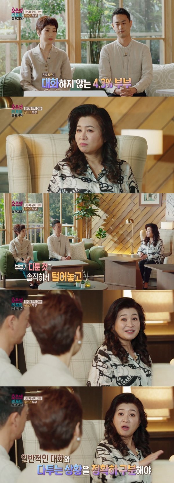 관찰된 부부의 일상은 그야말로 이중생활이었다. 자녀 앞에서는 한없이 다정한 부모였지만, 아이들만 없어지면 집안은 무거운 침묵만이 가득했다. 아이들의 등원 준비가 한창인 아침, 아내는 메신저로 남편을 호출했고, 늦잠을 자던 남편은 말없이 일어나 아이들의 등원을 도왔다. 마치 ‘맞교대’하는 회사를 연상시키는 광경에 오은영 박사와 MC들은 의아함을 감출 수 없었다. 자정이 넘은 늦은 시간, 퇴근한 아내가 집에 왔지만, 남편은 시선을 TV에 고정한 채 아내에게 눈길 한 번 주지 않았다. 한참 동안 두 사람 사이에는 대화가 단 한 마디도 오가지 않았다. 숨 막힐 듯한 부부의 생활에 하하는 “스튜디오에서 보는 우리도 숨소리도 못 내겠다”며 안타까움을 감추지 못했다. 오은영 박사는 “두 사람이 법적으로는 혼인 관계를 유지하고 있지만, 정서적으로는 이혼한 상태”라고 진단하며 이어 메신저로 대화하는 부부의 상황에 대해 “육아 관련 역할을 나눌 뿐, 이건 대화가 아니다”며 부부 관계를 진단했다.
