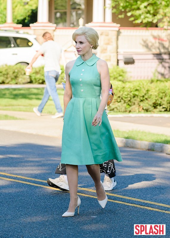 6일(현지시간) 미국 뉴욕의 한 영화 세트장에서 포착된 차스테인은 민트색 원피스에 하얀색 구두를 매치해 청량하면서도 우아한 매력을 뽐냈다.