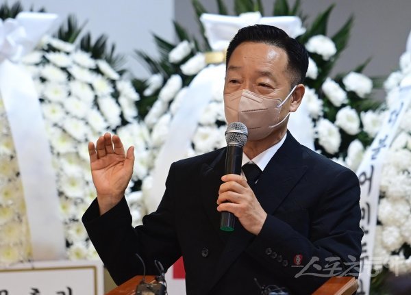 KBS 장수 프로그램 ‘전국노래자랑’의 현역 최고령 진행자 고 송해의 영결식이 10일 서울 종로구 연건동 서울대학교병원 장례식장에서 엄수됐다. 개그맨 김학래가 사회를 맡아 진행하고 있다.