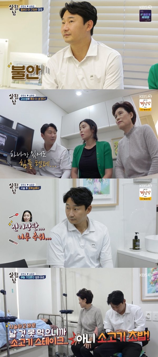 이천수의 세심한 간호는 계속됐다. 시술을 마친 뒤 힘들어하는 심하은에게 "고생 많았다"고 말한 이천수. 이후 추워하는 심하은을 위해 전기장판을 황급히 찾는가 하면, 일식집을 찾아 밥을 구입하러 가는 등 아내를 챙겼다.