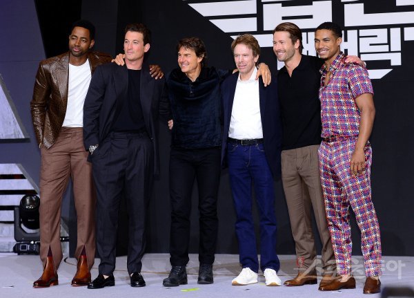 20일 서울 잠실 롯데호텔 월드에서 열린 영화 ‘탑건: 매버릭’ 프레스 컨퍼런스에 참석한 제이 엘리스, 마일즈 테일러, 톰 크루즈, 제리 브룩하이머, 글렌 포웰, 그렉 타잔 데이비스가 포즈를 취하고 있다.