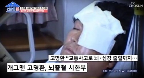 고명환은 "당시 15톤 트럭과 교통사고가 났다. 뼈는 100군데 이상 부러지고 뇌출혈과 심장 출혈까지 발생했다. 이틀 안에 죽을 수 있다고 했었다"라며 "심장이 터져서 죽을 수 있다고 했었다. 유언도 하고 정리할 거 있으면 하라고 했다"라고 심각했던 당시 상태를 전했다.