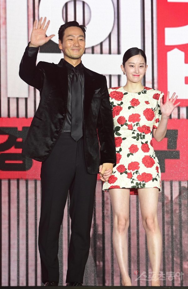 배우 박해수, 전종서가 22일 서울 강남구 삼성동 코엑스 그랜드볼룸에서 열린 넷플릭스 ‘종이의 집: 공동경제구역’ 제작발표회에서 포즈를 취하고 있다.