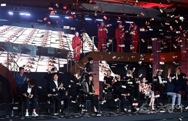 22일 서울 강남구 삼성동 코엑스 그랜드볼룸에서 열린 넷플릭스 ‘종이의 집: 공동경제구역’ 제작발표회에서 돈다발이 날리고 있다.