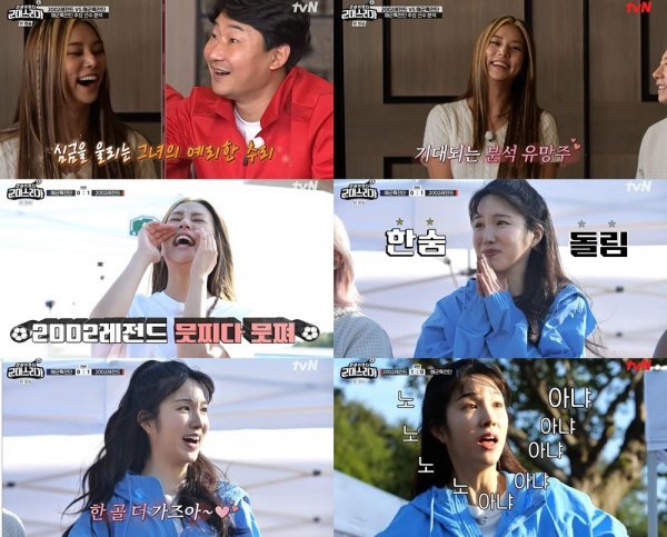 특히 이천수의 성공적인 골에 반응하는 진예의 환호를 듣고 “옆에 고라니 온 줄 알았어”라는 멘트가 덧붙여졌다. 진예와 솔빈은 전반전을 지켜보는 내내 쉼 없는 응원과 외계어까지 선보이며 ‘강력 서포터즈’의 존재감을 톡톡히 드러냈다.