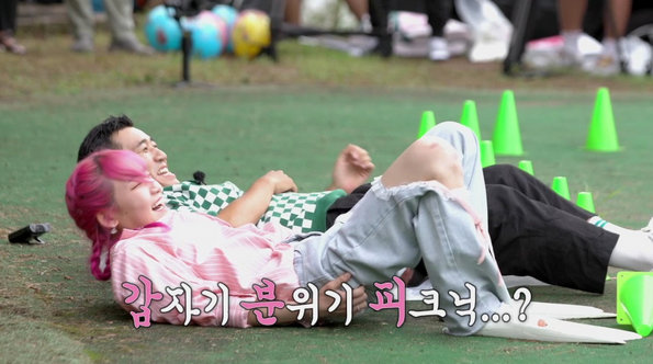 핑크빛 분위기는 복불복 게임에서도 이어진다. 오리발을 신고 레이스를 펼치는 게임에서 김종민은 마지막 주자인 히밥의 레이스에서 인간 장애물 역할을 맡았다. 순식간에 트랙을 돌던 히밥은 김종민의 앞에서 자신의 발에 걸려 넘어지는데, 두 사람은 뜻하지 않게 나란히 눕게 됐다. 멤버들은 "뭐 하는 거냐"고 소리치는 상황에서도 김종민은 마냥 웃었다.
