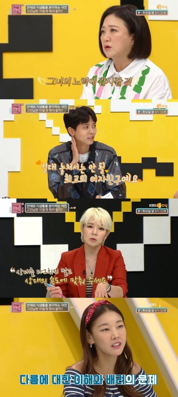 곽정은은 "체력의 문제라고 생각하면 쉽다. 체력을 누가 이기겠나"라고 이해했고, 한혜진은 "전에 고민남에게 힘들다고 이야기한 적 있는데 고민남이 상처를 받았다. 또 상처받을까봐 말하지 못한 것"이라며 여자친구를 대변했다.