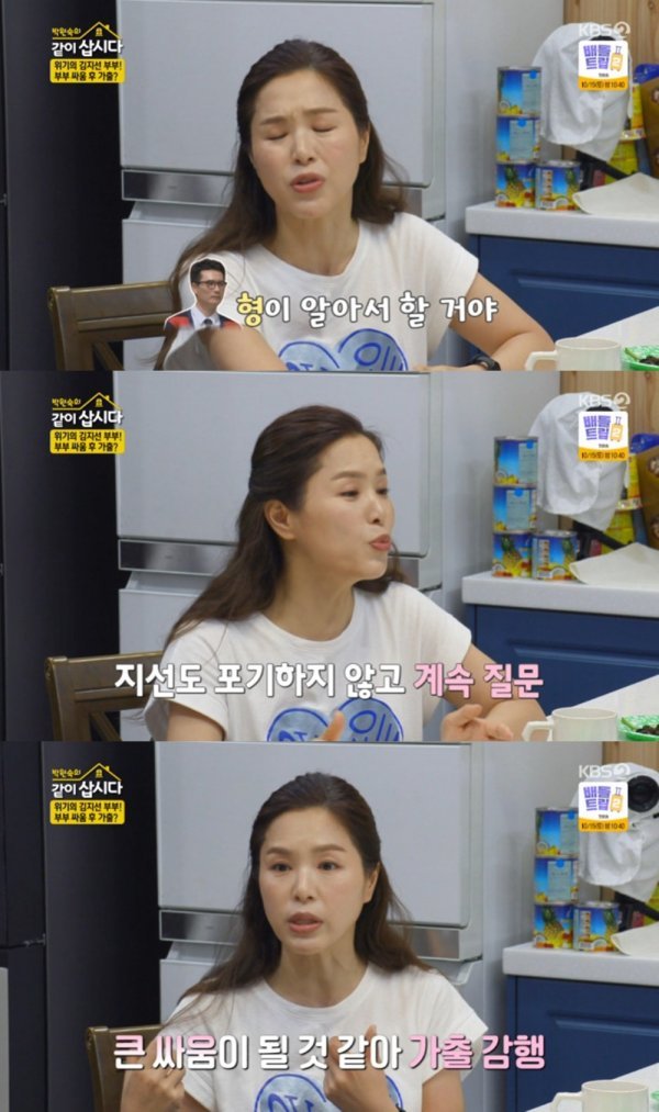 4일 오후 방송된 KBS2 ‘박원숙의 같이 삽시다’에서는 김지선이 남편과 부부 싸움을 한 이후 가출을 감행한 에피소드를 말하는 장면이 그려졌다.