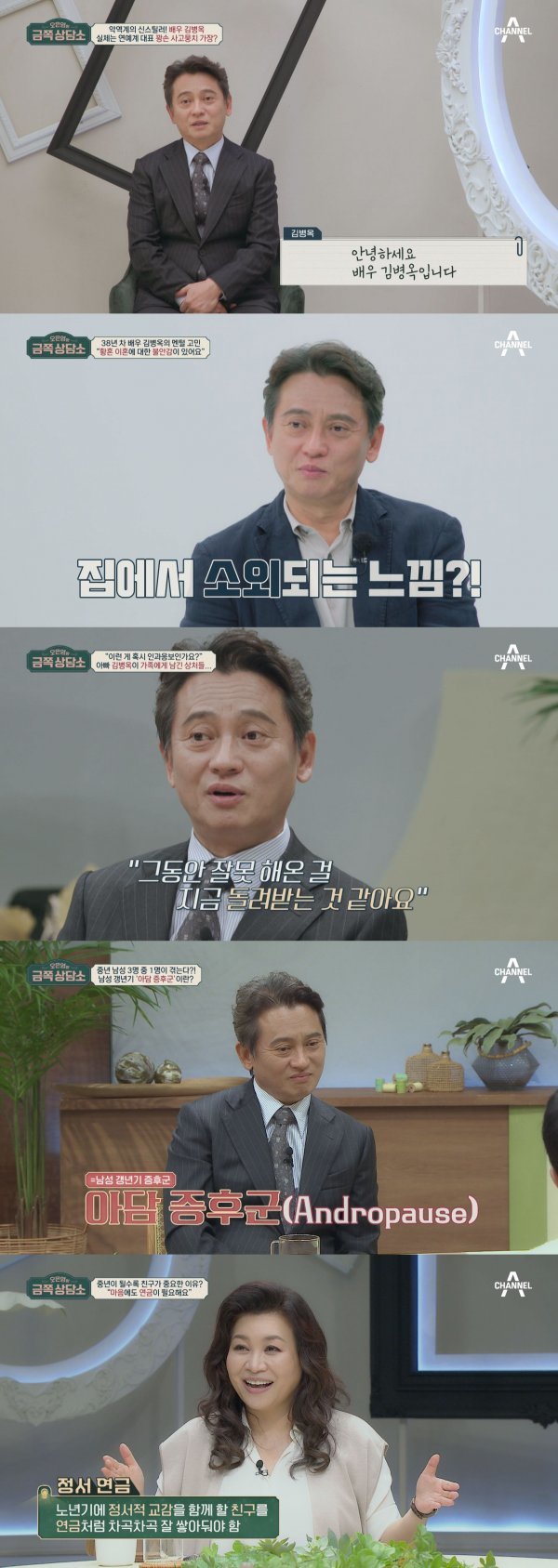 강렬한 눈빛으로 스크린을 압도하는 충무로의 ‘신스틸러’ 악역 전문 배우 김병옥이 상담소 문을 두드린다. 영화와 드라마를 넘어 광고까지 섭렵하며 다양한 분야에서 활발하게 활동 중인 배우 김병옥. 그는 결혼 28년 차지만 황혼 이혼에 대한 불안감을 보이며 “집에서 아내와 딸들에게 소외 당하는 느낌이 든다. 나는 들러리인 것 같다”고 고민을 털어놓는다.