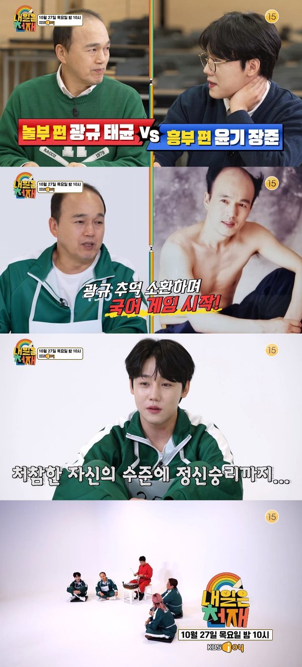 오늘(27일) \'내일은 천재\' 7회에서는 갑오징어 게임 국어편을 진행하는 \'브레인 가이드\' 전현무와 \'예체능 0재단\' 김광규, 김태균, 곽윤기, 이장준의 모습이 그려진다.
