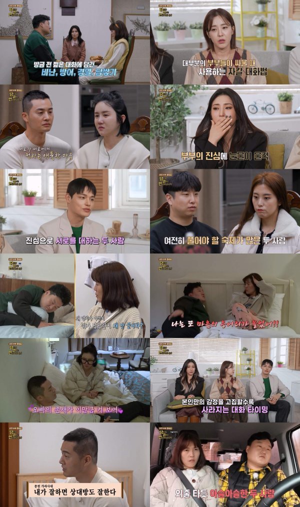 또 전문가는 윤종현·이지연 부부를 데려와 ‘눈의 대화’를 통해 1분의 시간 말없이 서로의 눈을 바라보고 이후 말로 고마움을 표시하게 했다. 이지연은 노력한 남편 윤종현에 대한 고마움을 전했다. 이어 윤종현도 “외롭게 자라왔던 나에게 옆에 있어 줘서 너무 고마워. 나는 평소에 사랑이 필요했던 사람이야. 나를 사랑해줘서 고마워”라고 진심을 표현했고 이에 아내 이지연은 윤종현을 안아줬다.