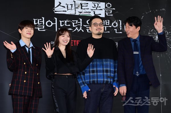 배우 임시완, 천우희, 감독 김태준, 김희원이 15일 서울 광진구 광장동 롯데시네마 건대입구점에서 열린 넷플릭스 ‘스마트폰을 떨어뜨렸을 뿐인데’ 제작보고회에서 포즈를 취하고 있다.
