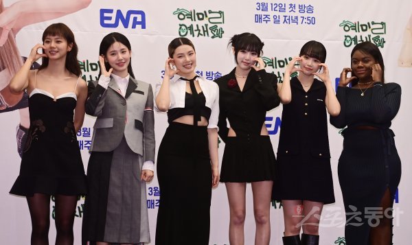 혜리, 미연, 리정, 최예나, 김채원, 파트리샤가 9일 서울 마포구 상암동 스탠포드 서울에서 열린 ENA 예능 프로그램 ‘혜미리예채파’ 제작발표회에서 포즈를 취하고 있다.